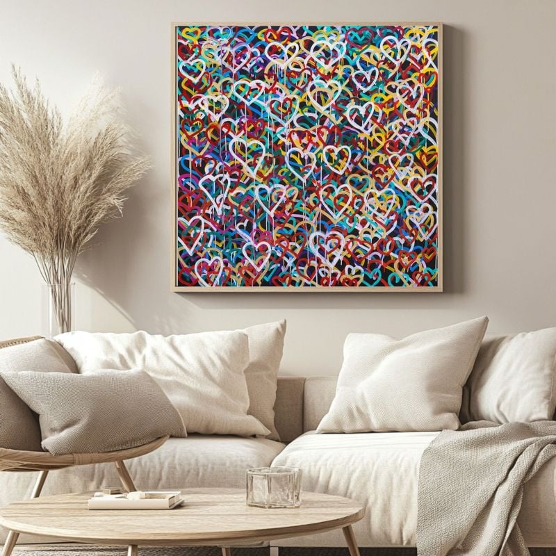 Rather than presenting a single focal point, Love Storm invites the viewer to wander through the composition, experiencing the accumulation of marks as a reflection of connection, presence, and emotional abundance.